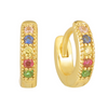 Brighten up your look with these gold huggie hoops featuring vibrant, multi-colored gemstones. A perfect mix of playful and chic, they add a pop of color to any outfit and are ideal for stacking or wearing solo.
